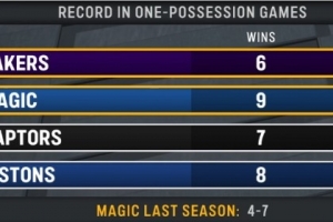 湖人主场迎战魔术,转播方给出一项统计,本赛季一回合定胜负的比赛,湖人6胜0负排名第一,魔术9胜3负排名第二。